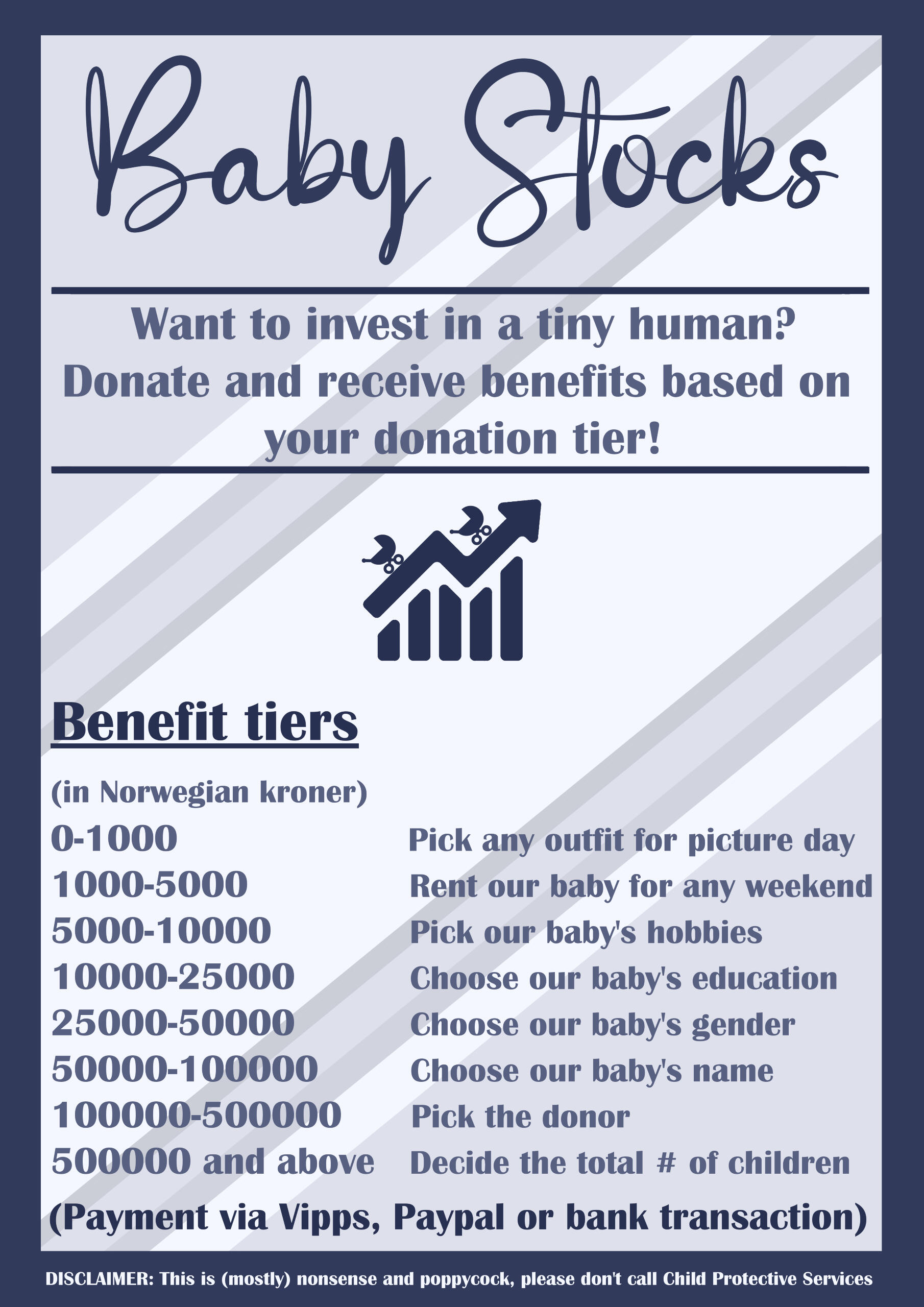 While pregnancies happen everyday - both on purpose and accidentally - it becomes slightly more difficult when you're a couple with not only one, but TWO uteruses. And while we can try for years ourselves, it seems unavoidable that we will need a bit of professional help. And that costs around an arm and half a leg. So, without further ado. Introducing BABY STOCKS!Please note, the idea of baby stocks is just a fun joke, we do not expect people to give us large sums of money. If you would rather get us a physical gift than donate money to our baby fund, we are interested in unique and personal items such as pieces of art or other handmade items. We are also interested in "experiences" such as tickets to events or similar items.